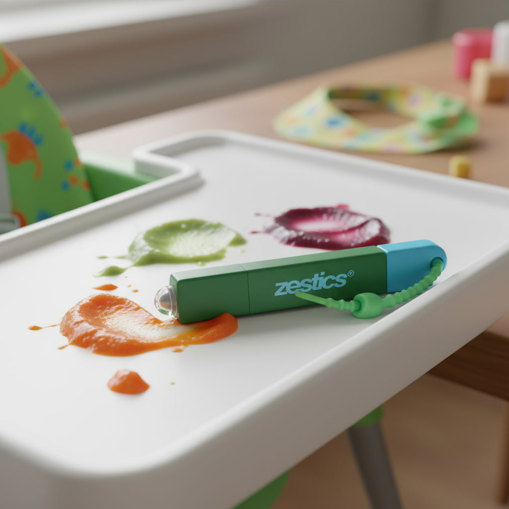 Zestics packs smart, bleach-free, waterless technology into a pocket-sized pen. Safe for kids, fabrics, and everyday messes.